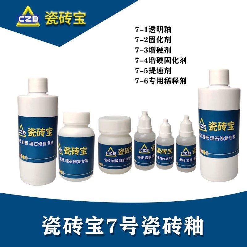 7 号组合釉是散装陶瓷釉,是瓷砖岩板无痕修复开创材料。由 7-1 透明釉 /7-2 固化剂 /7-3 增硬剂 /7-4 增硬固化剂7-5 提速剂 /7-6 稀释剂组成
