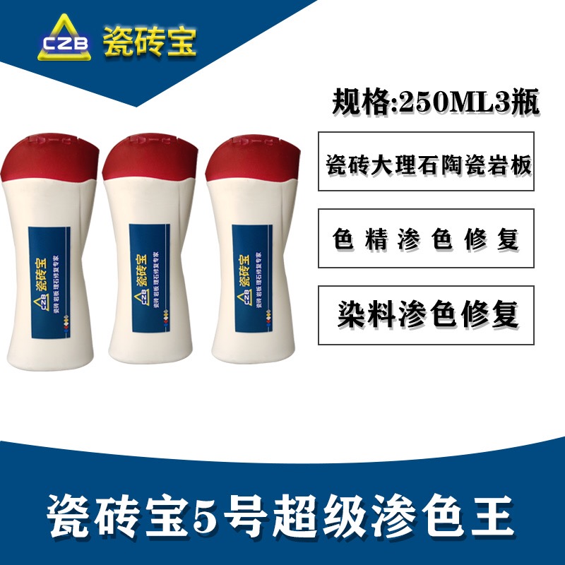 瓷砖宝 5 号,超级渗色王,这个产品主要是针对瓷砖,大理石,陶瓷岩板表面各种渗色,比如色精、色浆、染料、颜料、染色水、染发剂,各种带颜色的污染,深层渗透,都可以把它清洗得干干净净。